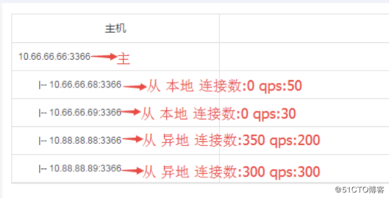 2.选目标实例,假如例子中的4个从都是存活的,那么根据先本地后异地原则,选出10.66.66.68:3366,10.66.66.69:3366,然后再去查连接数,在连接数都相同的情况下,则去比较QPS,选出QPS负载低的10.66.66.69:3366作为目标实例。