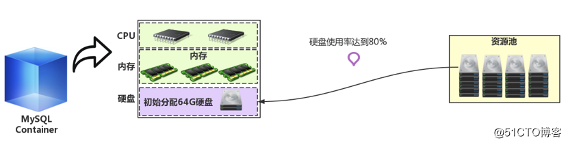 数据库以前的服务存在资源浪费的一个主要原因就是资源初始分配粒度太大,一开始就为业务提前预支3年甚至5年的资源。而资源池中的资源是有限的,不可能让所有业务都提前预支资源,从而导致有些业务没有资源。ContainerDB采用流式的方式进行资源的持续交付。每个业务接入初始都只会分配标准的64G硬盘,随着业务的发展和数据量的持续增加,会持续增加硬盘容量直到到达硬盘限制的上限256G。