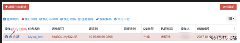 1.监控系统检测到主库宕机,则自动创建切换任务,进行自动切换或者手动切换,以手动切换为例: