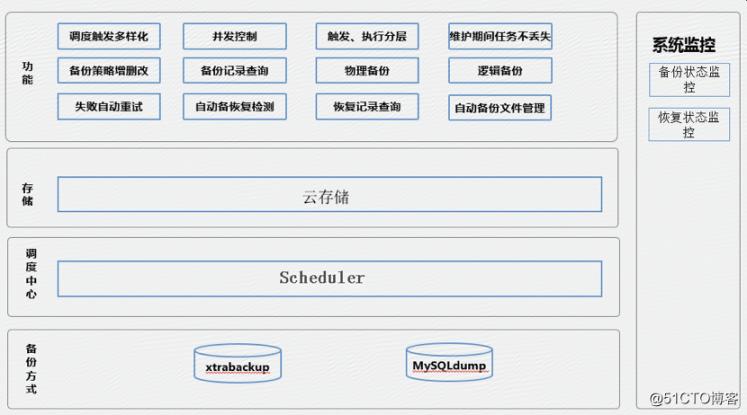 备份系统每次备份时都会进行实例健康状态检查、备份运行状态检查等,防止对无效的数据库实例进行备份;恢复系统主要是在需要进行数据恢复、弹性扩容等等需要从备份文件恢复成运行的数据库实例时使用,能够让DBA通过简单地操作即可完成数据的恢复;恢复检测在调度系统的指挥下自动对备份文件可用性进行检测,来帮助DBA及时发现不可用的备份文件;备份失败有些是能够通过失败自动重试来解决,但有一部分是重试所不能解决的,需要进行相应修复,因此开发了自动修复系统来自动修复因为环境等问题引起的备份失败。