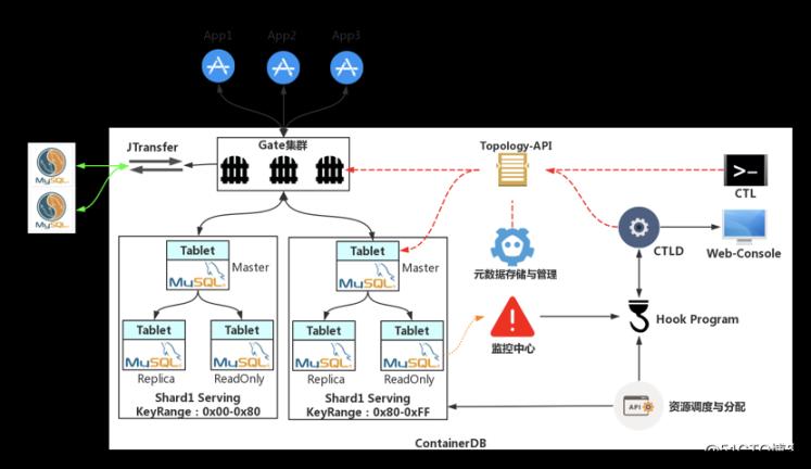 ContainerDB针对每个业务应用都有逻辑库,逻辑库中定义了针对整个业务所有表的拆分键(Sharding Key)进行哈希取模运算时模的范围(KeySpace),在每个逻辑库中可以创建多张表,但是每个表中必须定义Sharding Key。通过该Sharding Key将表中的数据拆分成多个分片(Shard),每个分片都对应一个KeyRange,KeyRange表示对Sharding Key进行哈希取模运算之后得到的值(Sharding Index)的一个范围,每个Shard都由一整套MySQL主从架构提供数据库服务支撑。应用程序只跟Gate集群进行交互,由Gate根据元数据信息和SQL语句完成数据写入和查询的自动路由。ContainerDB中的监控中心会对所有的基础服务和资源使用状况进行实时监控,并通过在监控中心注册的Hook程序自动进行动态扩容、故障自愈、分片管理等,而这一系列操作对应用程序来说是完全无感知的。
