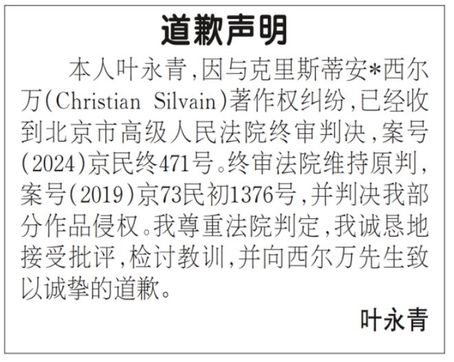 记者在1月23日出版的《法制日报》看到了道歉声明。声明写道:“本人叶永青,因与克里斯蒂安*西尔万(Christian Silvain)著作权纠纷,已经收到北京市高级人民法院终审判决,案号(2024)京民终471号。终审法院维持原判,案号(2019)京73民初1376号,并判决我部分作品侵权。我尊重法院判定,我诚恳地接受批评,检讨教训,并向西尔万先生致以诚挚的道歉。”