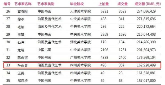 雅昌艺术市场监测中心数据显示,在中国八大美术院系艺术家历年拍卖成交总额前50名中,叶永青以387件作品成交量,创下1.63亿元的收入,位列榜单第33名。以此计算,叶永青成功拍出的作品均价高达42.1万元。