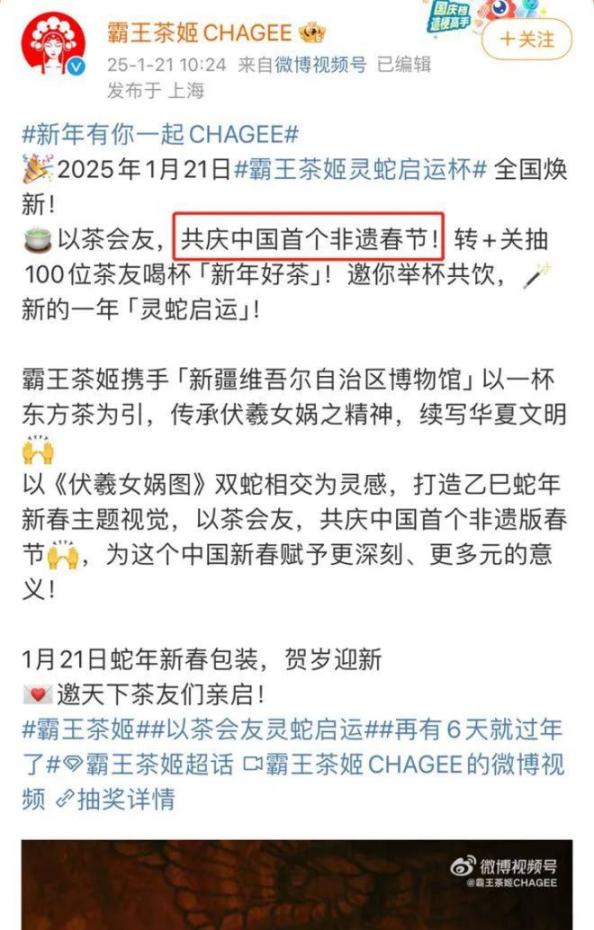 首先,这个春节意义非凡。2024年12月4日,中国申报的 “春节 —— 中国人庆祝传统新年的社会实践”被成功列入《人类非物质文化遗产代表作名录》。今年恰逢中国春节申遗成功后的首个新年。因此,有部分网友呼吁霸王茶姬品牌尽快作出回应。