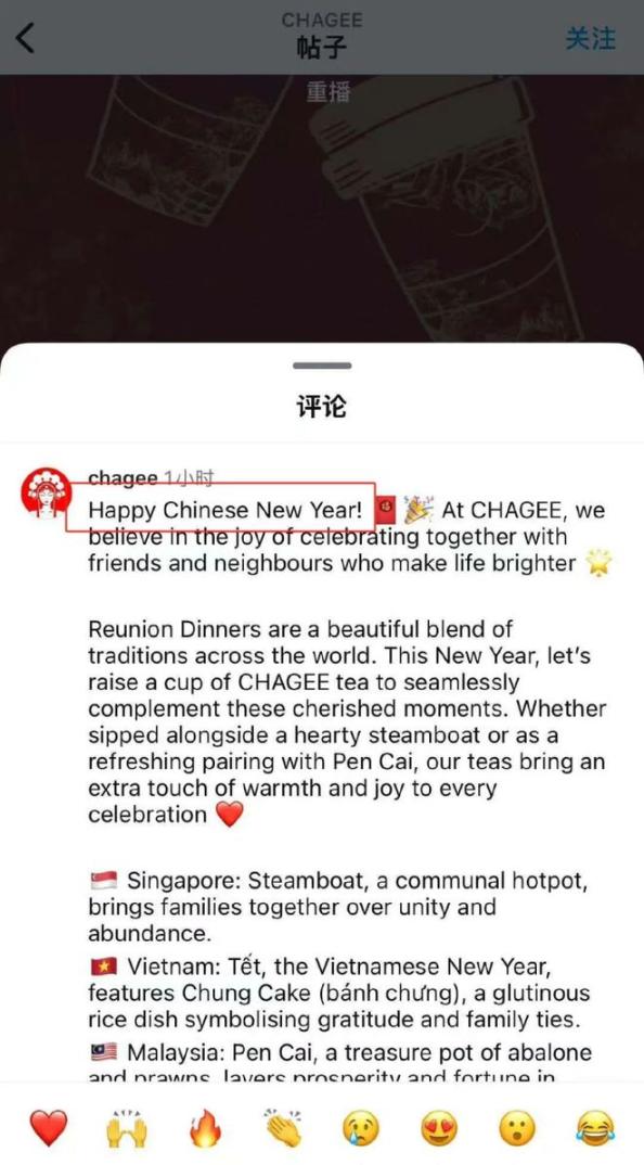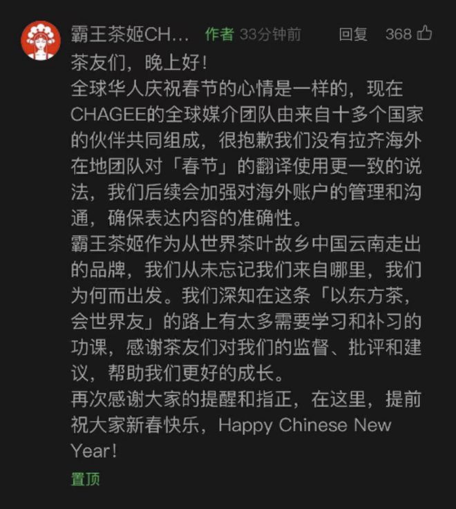 1月24日晚,霸王茶姬CHAGEE还就“春节”一词翻译不当致歉: “很抱歉我们没有拉齐海外在地团队对‘春节’的翻译使用更一致的说法,我们后续会加强对海外账户的管理和沟通,确保表达内容的准确性。 ”
