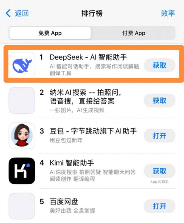 据苹果APP Store中国区免费榜,2025 年 1 月 27 日,DeepSeek 成功登顶中国区苹果 App Store 免费榜,成为中国区第一。