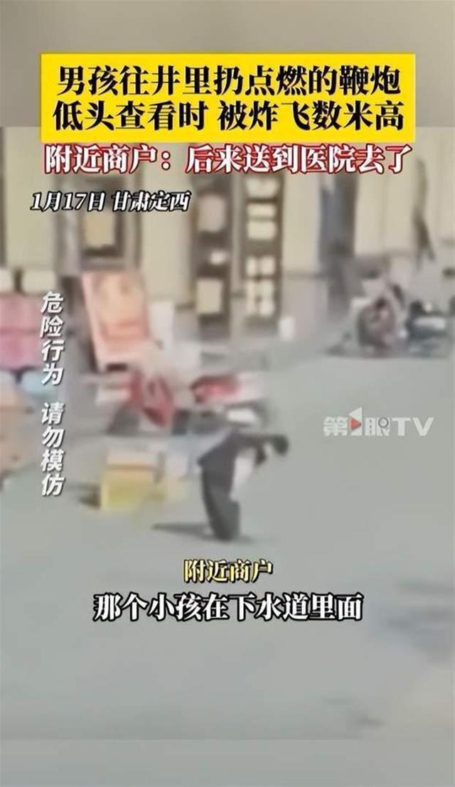 其实,在春节前已经发生过一起类似的安全事故。1月17日,在甘肃定西临洮县,一名男童点燃爆竹后扔进了窨井,并向井内探头查看,地下发生闪爆,冲击波将男童掀起数米高,窨井周围部分地砖被炸损。1月18日,记者从当地政府部门获悉,男童被转送到兰州救治,现已脱离危险。