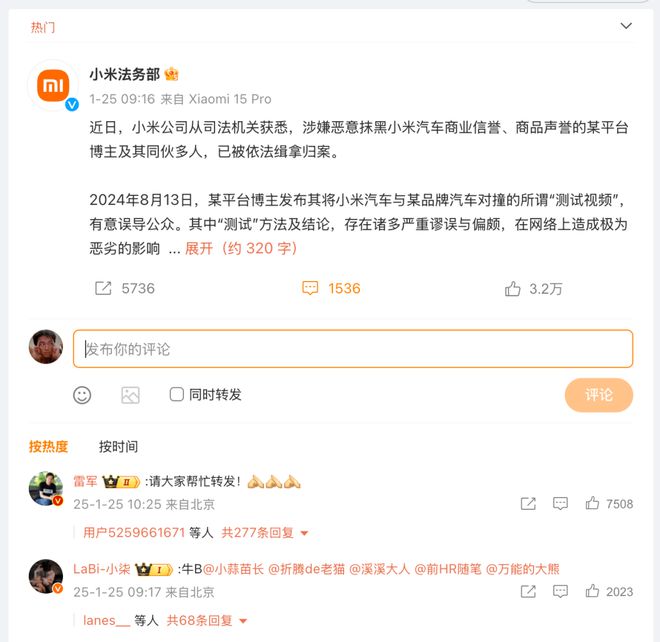 同样是起诉博主不实言论,卖车卖手机的小米受到的待遇就完全不同。小米法务部甚至公开发布了条微博,"涉嫌恶意抹黑小米汽车商业信誉、商品声誉的某平台博主及其同伙多人,已被依法缉拿归案"。