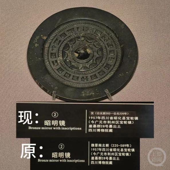 徐伟哲告诉记者,这枚铜镜位于川博的南北朝馆展厅,标注为“昭明镜”。他认为专业描述应为:西汉连弧纹昭明镜,更关键的是——典型的汉代镜子,怎么跑到南北朝馆的?
