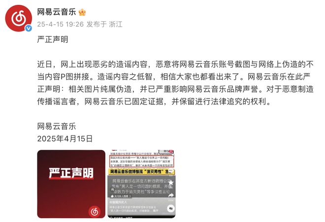 4月15日晚间,网易云音乐在社交平台发布声明称,近日,网上出现恶劣的造谣内容,恶意将网易云音乐账号截图与网络上伪造的不当内容P图拼接。相关图片纯属伪造,并已严重影响网易云音乐品牌声誉。对于恶意制造传播谣言者,网易云音乐已固定证据,并保留进行法律追究的权利。