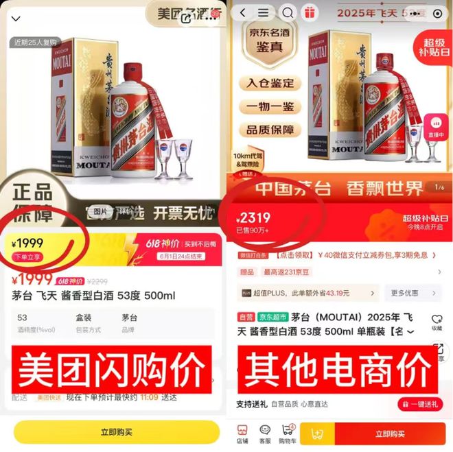 有网友实测发现,目前,美团闪购飞天茅台、五粮液等热门白酒的价格显著低于京东等电商平台,现货到手速度在30分钟左右,“午饭前下单,吃饭时就喝上了”。53度飞天茅台美团闪购最低到手价为1999元,京东等则为2319元。52度五粮液美团闪购最低到手价为858元,京东等则为979元。