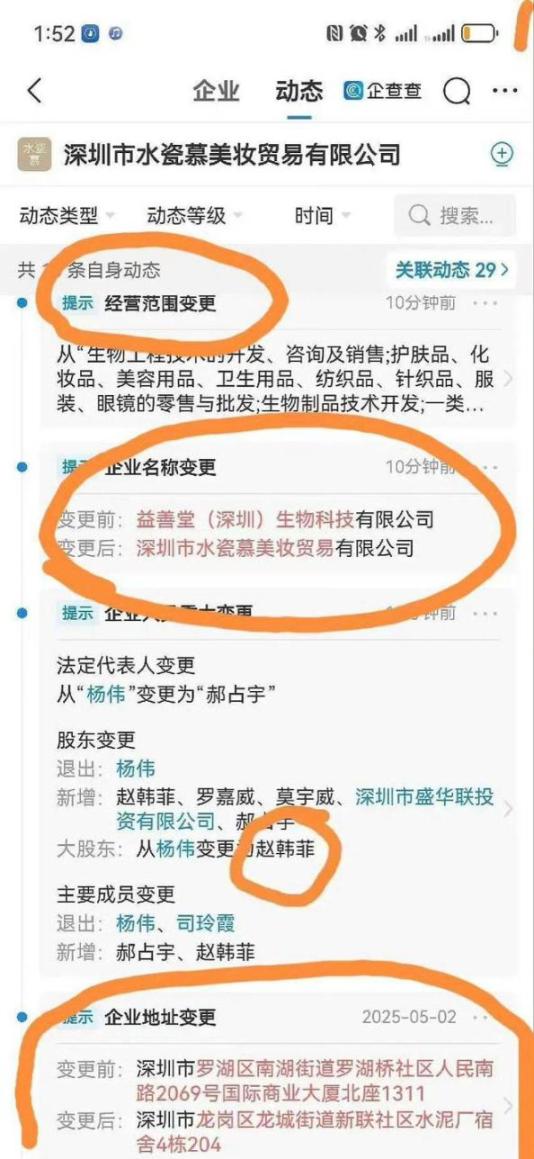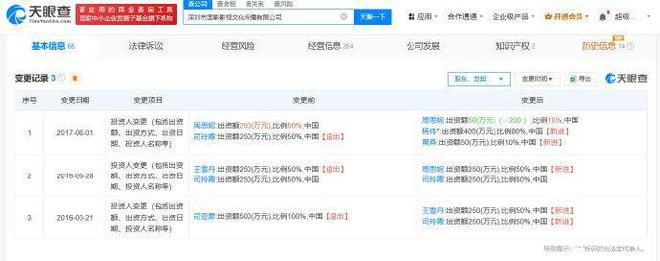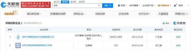 天眼查商业履历信息显示,黄杨某甜父亲杨伟除近日退出的深圳市水瓷慕美妆贸易有限公司外,还关联深圳市国影影视文化传播有限公司、东阳市横店黄杨钿甜影视工作室。其中,深圳市国影影视文化传播有限公司成立于2014年10月,注册资本500万人民币,由杨伟担任法定代表人、总经理、执行董事并持股80%。今年4月25日,该公司发布减资公告,注册资本将由500万人民币减至2万人民币。变更记录显示,杨伟于2017年6月入股该公司并任职。