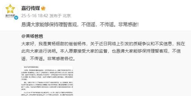 5月16日,嘉行传媒针对近期“黄杨某甜爸爸 雅安公务员”事件发布声明,称该公司、黄杨某甜女士及其父母愿意接受社会公众的合理监督。此后,黄杨某甜的爸爸杨伟也在社交媒体上对该事件进行说明。