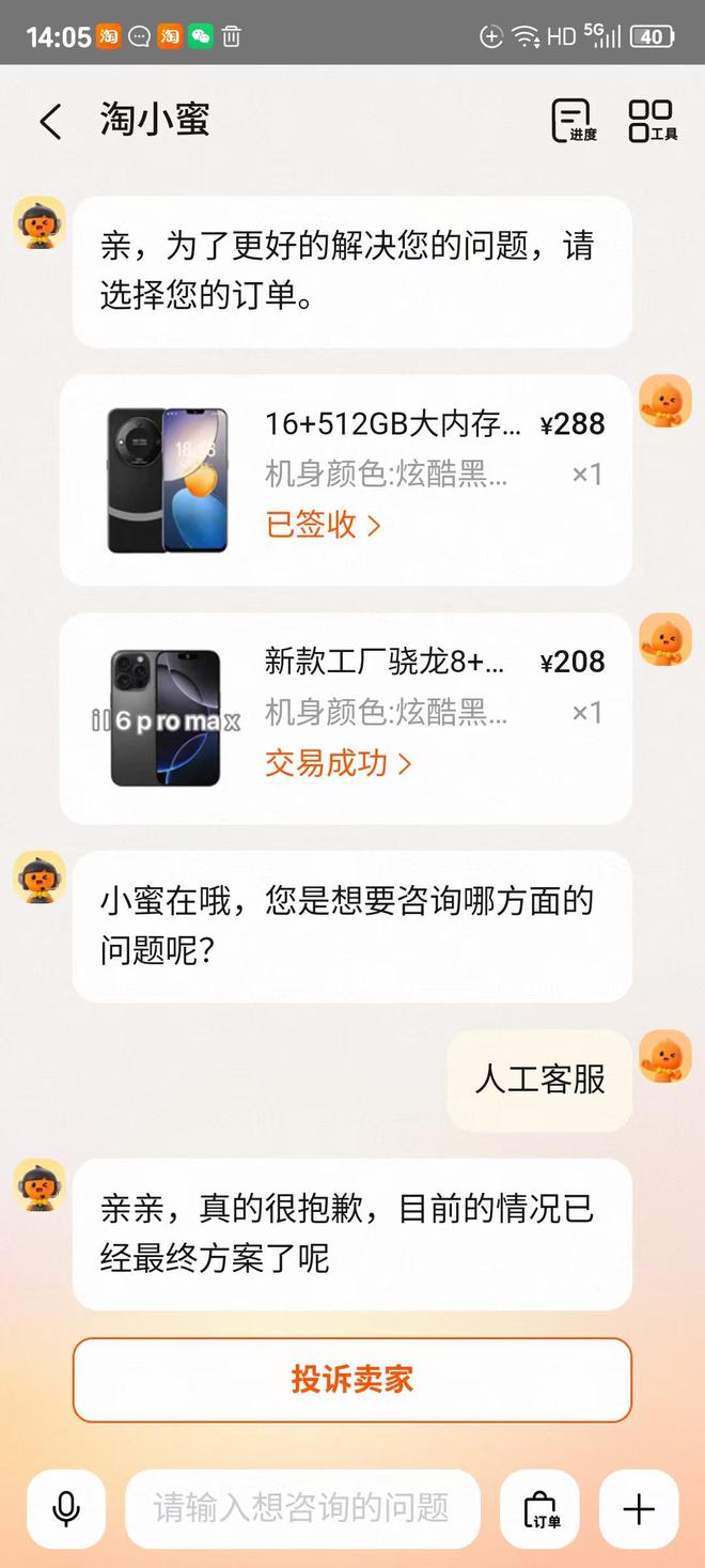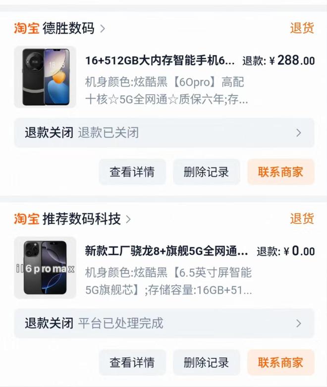 随后记者联系淘宝客服,经查询,陈先生购买的288元手机因超过时间,退款通道已关闭,但客服可帮其恢复售后通道;208元的手机目前已有高级客服介入。据陈先生提供的信息显示,客服补偿了他50元无门槛代金券,但尚未办理退款退货。