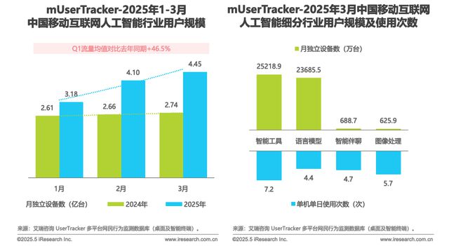 在人工智能行业,行业迎来爆发式增长,技术应用从通用场景向垂直领域深化。2025Q1,人工智能行业月独立设备数均值同比增长46.5%,细分领域中智能工具、语言模型占据主导,智能伴聊、图像处理用户规模相对较小,但用户使用频次较高,行业已从概念验证转向规模化应用阶段。