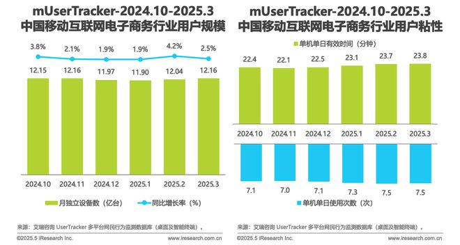 在电子商务行业,2025年1-3月,电子商务行业流量峰值逼平去年11月,至一季度末用户单机单日有效时间达23.8分钟、使用次数达7.5次,用户粘性连续四个月环比正增长,线上消费势头稳中向好,平台精细化运营成效明显。3月,京东(09618)APP流量同比增速3.4%领跑行业,淘宝、拼多多(PDD.US)等的活跃用户规模略有收缩,市场竞争格局持续演变。TOP3平台间用户重叠率高,企业需通过物流、会员体系等差异服务挖掘自身特色,提升用户忠诚度。