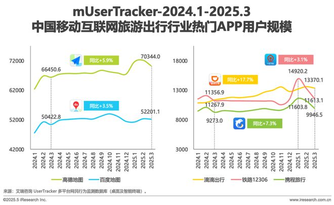在旅行出行行业,高德地图、百度地图占据导航市场领先地位;铁路12306、携程APP流量峰值与春运呈强相关性。