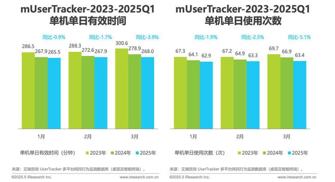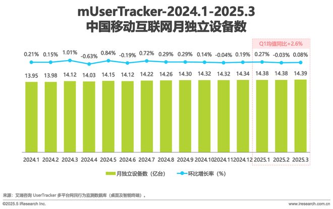 智通财经APP获悉,6月10日,艾瑞咨询发布2025Q1中国移动互联网流量季度报告。其中提到,2025年一季度,中国移动互联网月独立设备数均值同比增长2.6%,但单月环比增速较低,分别为0.27%、-0.03%、0.08%,市场需求趋稳,行业进入存量竞争深化阶段。
