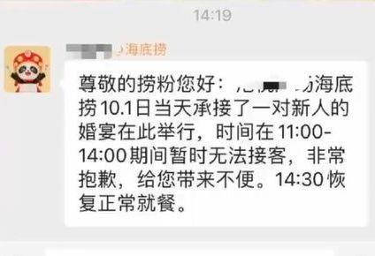 近日,网友发帖称,河北石家庄一家海底捞门店将于10月1日11时至14时为一对新人承办婚宴。该时段,暂停对外接待普通顾客。