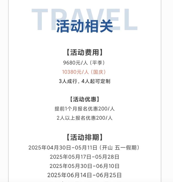 该工作人员提供的行程报价显示,淡季价格为9680元/人,国庆黄金周期间则上调至10380元/人。整个行程历时约12天,其中徒步路段总里程79公里。该社全年共开设12个出发排期,覆盖整个可徒步时段。