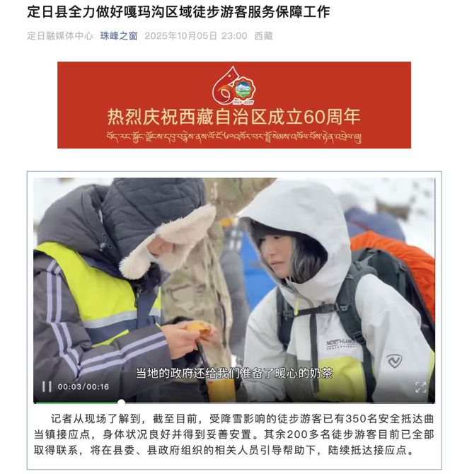 10月6日11时,定日县融媒体中心再次发文称,此前安全抵达接应点的徒步游客已全部得到妥善安置。在定日县委、县政府的统一部署下,各相关部门迅速响应,有序组织开展集中转运工作,将全部人员安全转移至曲当镇及周边酒店进行妥善安排。同时,及时调配发放御寒物资,保障餐饮供应,组织医疗健康检查。目前,人员身体状况良好。
