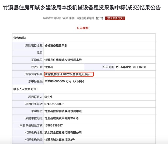 12月3日,《竹溪县住房和城乡建设局本级机械设备租赁采购中标(成交)结果公告》第五项评审小组成员,被曝来自网络文库的《人名大全》,媒体质疑该项目评审使用虚名凑人数。