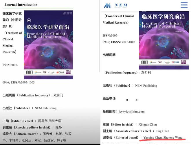 不过,记者在中国知网查询发现,《临床医学研究前沿》期刊发表的相关论文,并未收录其中。按照该杂志官网简介,该期刊隶属NEM出版有限公司,而该公司涵盖69种不同学科领域的期刊,涉及文学、法学、教育学、化学、中医学、农学、物理学等多个方向。