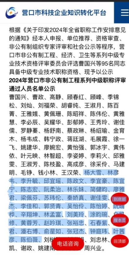 另外,“营口市科技企业知识转化平台”2024年9月30日公布的一份《2024年营口市非公有制工程系列中级职称评审通过人员名单公示》中,部分人员姓名和排列顺序与百度文库《10000中国普通人名大全》中部分名单一致。