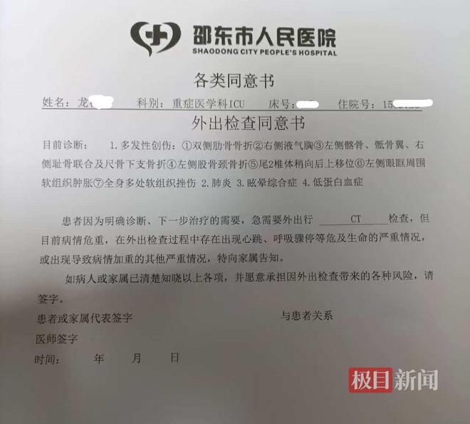 在家属提供的邵东市人民医院CT诊断报告单上,极目新闻记者看到,龙婆婆多处受伤、多处骨折。目前,张先生已向邵东市多个部门反映此事。
