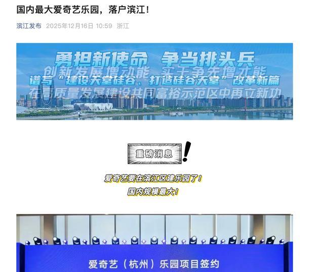 【环球网科技综合报道】12月17日消息,据“滨江发布”官方公布,杭州市文化广电旅游局、滨江区政府、北京爱奇艺科技有限公司三方签约,“爱奇艺乐园”项目正式落户位于“大莲花”旁的杭州市“文化两中心”,计划于2027年开放。