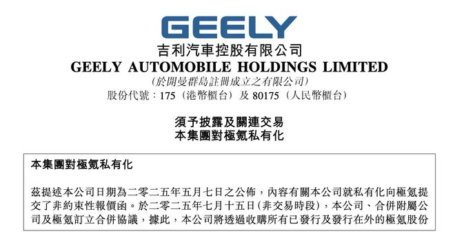 公开信息显示,吉利汽车与极氪早在今年 7 月已签署合并协议,当时即明确吉利将收购其尚未持有的全部极氪股份,极氪股东可选择以现金或置换吉利汽车股份作为对价。