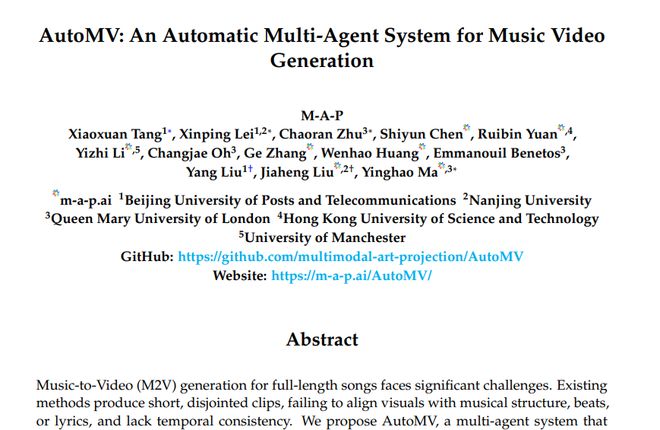 这项由M-A-P研究组织联合北京邮电大学、南京大学、伦敦玛丽女王大学等多所院校开展的突破性研究发表于2025年12月,研究团队开发出名为AutoMV的自动音乐视频生成系统,论文编号为arXiv:2512.12196v1。领导这项研究的包括来自北京邮电大学的唐小轩、雷新平,伦敦玛丽女王大学的朱超然、马映昊等多位研究者,他们在音乐视频自动生成领域取得了前所未有的进展。