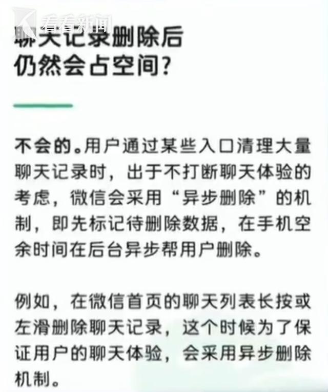 但也有人发现,即使删除了聊天记录,微信占用的存储空间可能不会马上减少。对此,微信解释说,为了不打断用户正常聊天体验,它们采用的是异步删除机制。简单说,真正的清理操作,并不是立即执行,而是会在手机空闲时在后台完成。