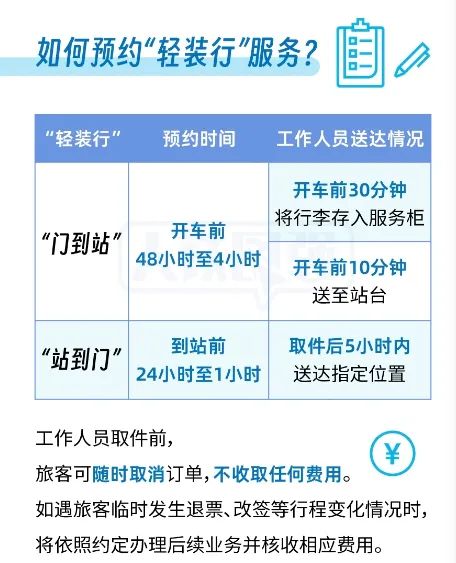 具体来看,在同城距离车站35公里内,旅客根据实际需要可选择以下两种“轻装行”服务。
