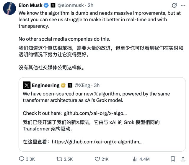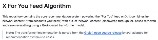 刚刚, 平台(原 Twitter 平台)公布了全新的开源消息:已将全新的推荐算法开源,该算法由与 xAI 的 Grok 模型相同的 Transformer 架构驱动。