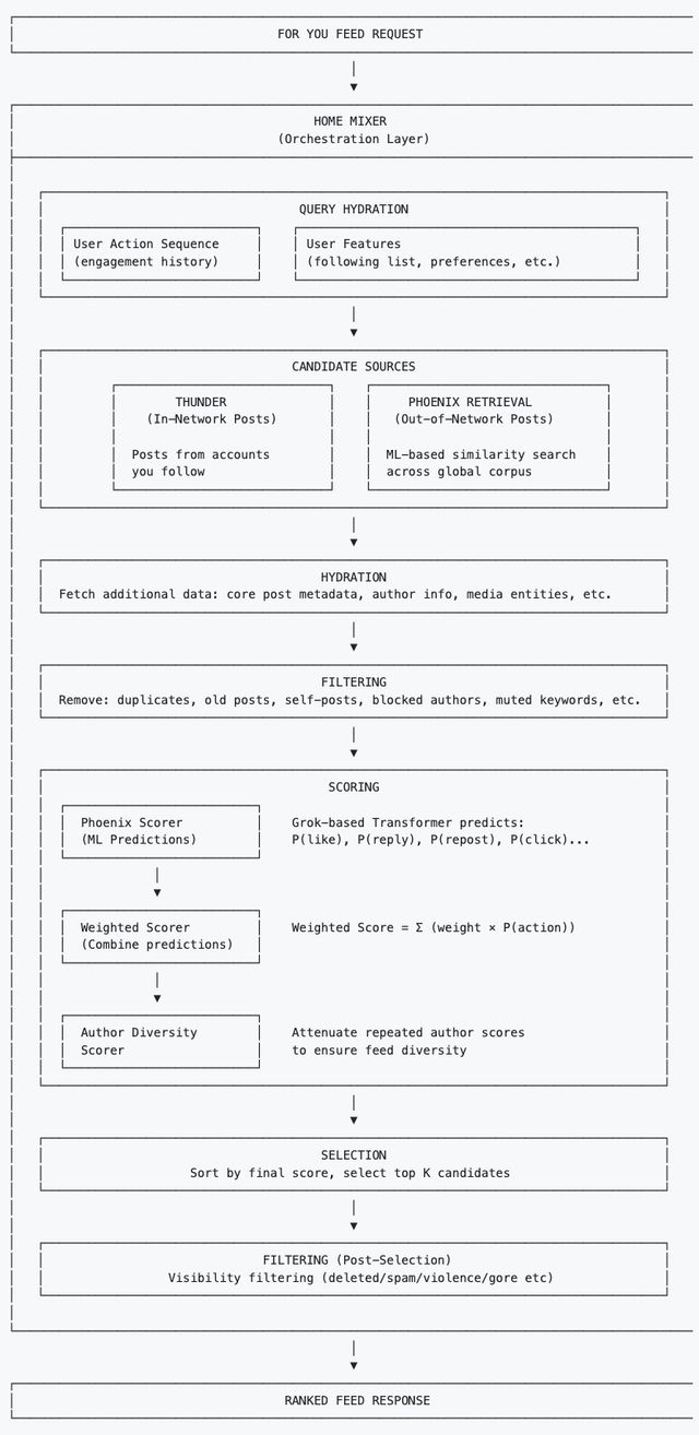 整个系统的核心是称为 Thunder 和 Phoenix 的组件。「For You」信息流算法会从两个来源中召回、排序并过滤内容: