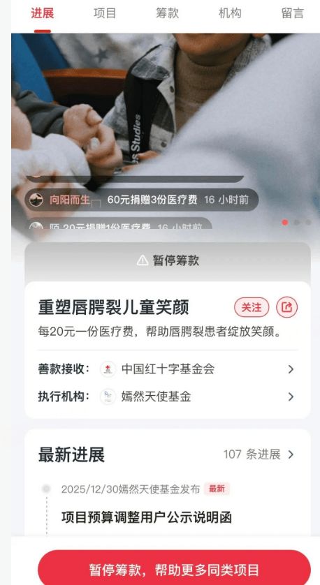 今天(1月20日),嫣然天使基金官方微博发出图文:“亲爱的嫣然天使基金捐赠人,您好。近期我们收到了大家的大量捐款,我们将珍惜并妥善将大家的善款持续用于唇腭裂患者的医疗救助项目。按照相关制度法规,项目预算已经筹满的,我们将陆续暂停筹款项目,待完成备案补正后再开放捐赠渠道。”