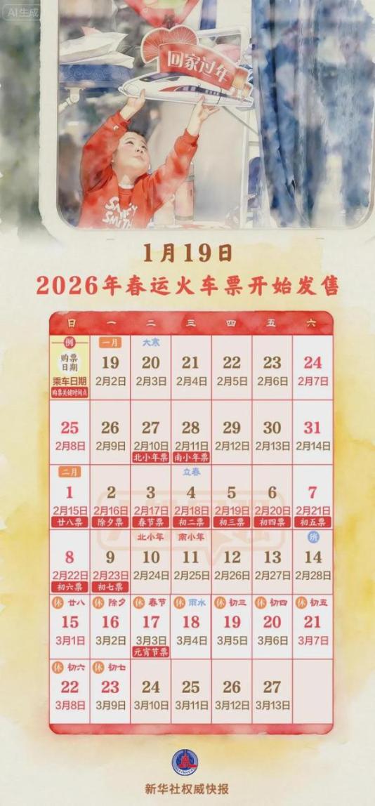 此外,春运首日火车票于1月19日开始发售。2026年铁路春运自2月2日开始,至3月13日结束,为期40天。全国铁路预计发送旅客5.39亿人次、同比增长5.0%,节前客流高峰日预计为2月13日(腊月廿六),节后客流高峰日预计为2月23日(正月初七)。