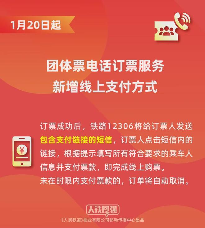 同时,12306客服中心此前推出的团体票电话订票服务新增线上支付方式,订票成功后,铁路12306将给订票人发送包含支付链接的短信,订票人点击短信内的链接,根据提示填写所有符合要求的乘车人信息并支付票款,即完成线上购票,未在时限内支付票款的,订单将自动取消。