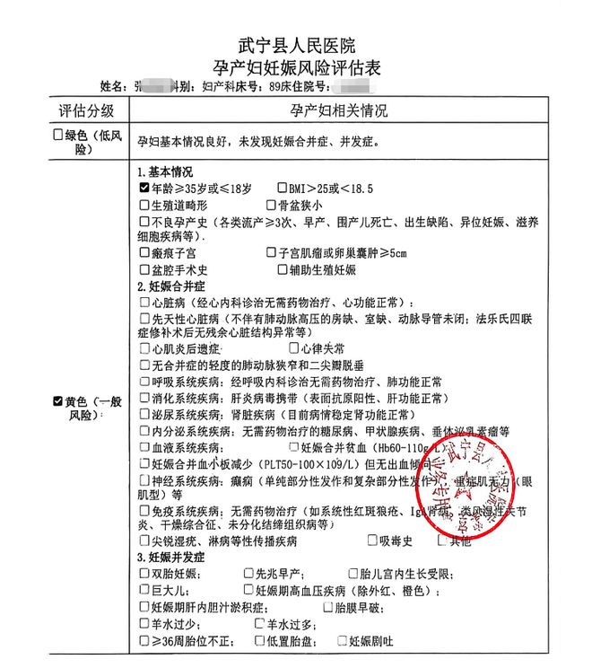 入院记录显示,张女士当时孕38周,胎监正常。医院彩超检查估计胎儿体重约3804克,提示存在“脐带绕颈两周”的情况。入院记录还显示,张女士孕早期地贫筛查未见异常,无创DNA检查结果为低风险。孕23周行四维彩超显示中孕,单活胎。传染病检查未见异常。孕产妇妊娠风险评估表中,评估等级为黄色(一般风险),原因为大于35岁,妊娠合并症、并发症均无。