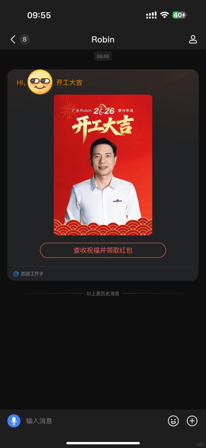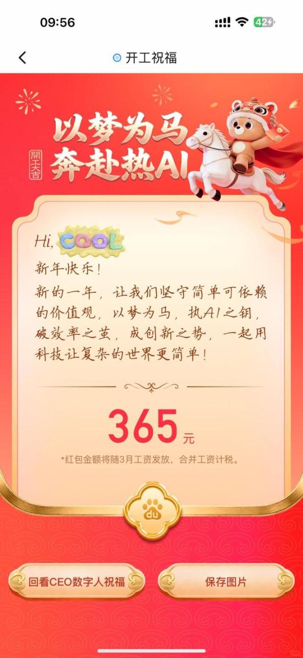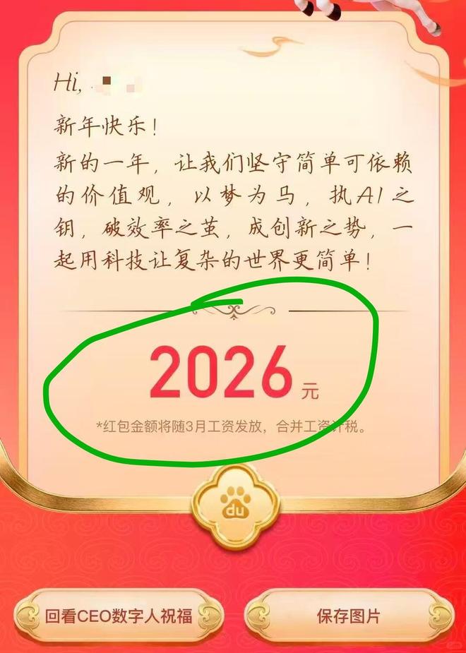 2月24日,开工首日,百度通过百度创始人李彦宏的数字人为每个员工发开工随机红包,红包金额有365,588,666、888元、2026元不等,员工最高可以获得2026元的超大额开工红包,实习生则可获得188元的开工红包。