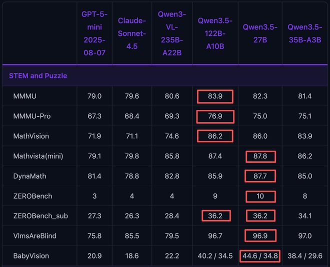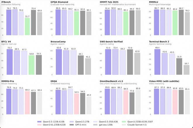 三、基准测试:122B大而全,35B强在智能体,27B工程实用度高