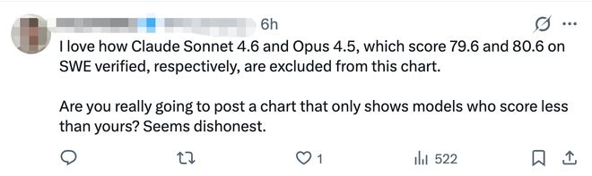 不过也有网友表达了更高的期待:“我真搞不懂为什么这张图表(测评图表)里没有Claude Sonnet 4.6和Opus 4.5这两款在SWE认证评分中分别高达79.6分和80.6分的机型。”