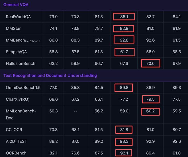 在多语言能力维度,Qwen3.5-122B-A10B表现尤为突出。在多模态能力维度,其在通用VQA领域也表现强势,拿下RealWorldQA(真实世界场景下的视觉问答能力)、MMStar(多模态综合理解与推理能力)等四项最高分;Qwen3.5-27B在HallusionBench(多模态幻觉抑制与事实一致性能力)、CharXiv(RQ)(学术文档的理解与检索能力)等评测中表现最佳。