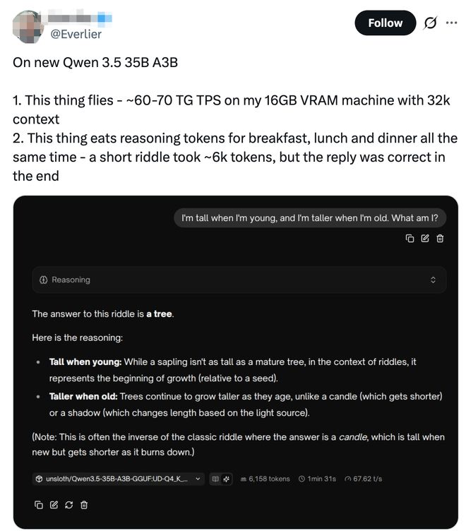 一位开发者分享了其部署Qwen3.5-35B-A3B的情况,称模型可以跑在16GB的显存机器上,处理32k上下文时,每秒处理数能达到60-70个任务;但他也提到,模型吞token的速度惊人,一个短谜题就用了大约6k token,但最终答案是正确的。