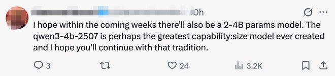 也有网友开启了催更模式。有网友称:“有计划发布小型模型吗?比如1B/3B/7B?”,也有网友喊话:“我希望未来几周内也能推出2-4B参数的型号,Qwen3-4B-2507或许是迄今为止性能与体积比最高的型号,我希望你们能延续这一传统。”