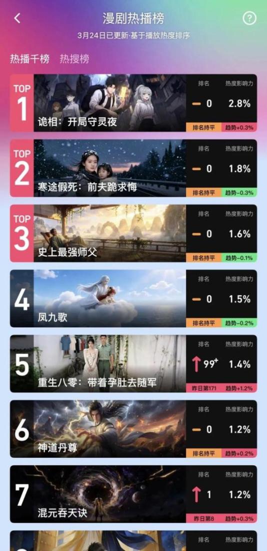 并且,每一天热播千榜更新时,火龙漫剧还会显示每部作品在千榜上的排名升降情况,以及热度增减的百分比趋势。