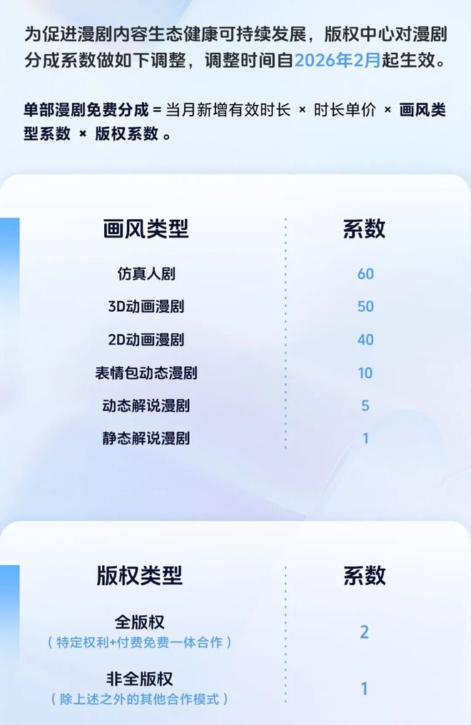 2026年2月,抖音版权中心发布公告,对漫剧分成系数进行调整。画风类型系数方面,AI仿真人剧的系数最高,达到了60,3D动画漫剧和2D动画漫剧的系数则分别为50和40,动态漫、解说漫更是低得多。
