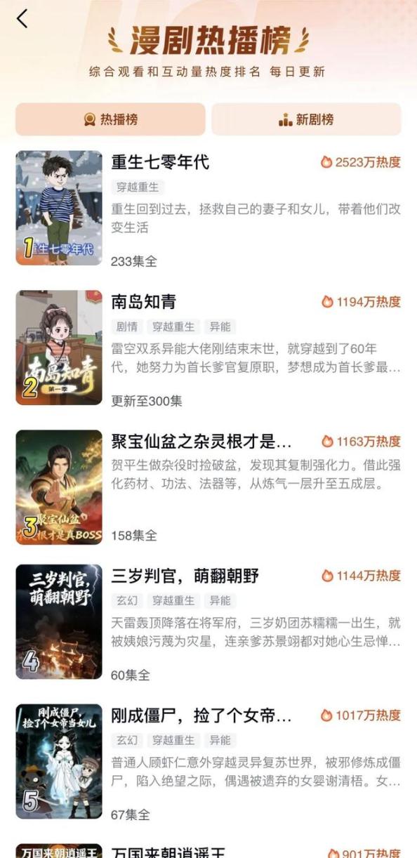 其次,红果漫剧的榜单页仅仅围绕漫剧展开,分为推荐榜、热播榜和新剧榜。其中,推荐榜根据观看/互动量及个人兴趣排名,热播榜依据全局观看/互动综合热度排名,新剧榜则针对上架7天内的剧集热度值进行排名。