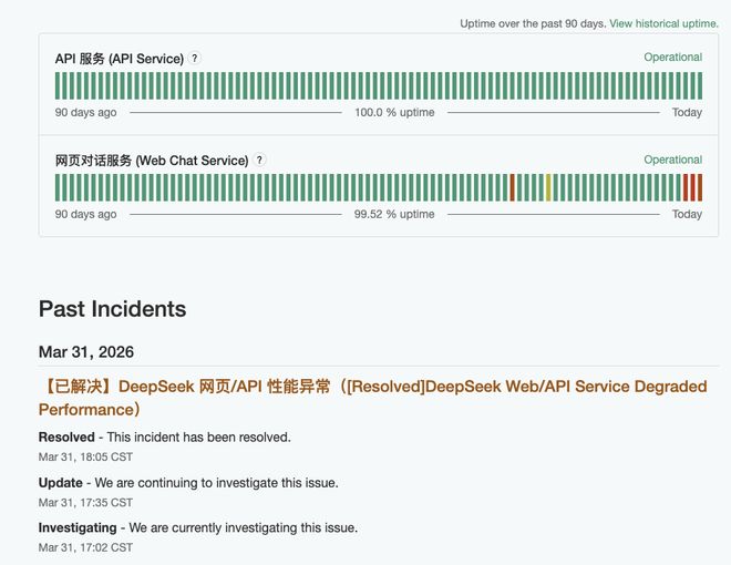 3月31日17时02分,DeepSeek服务状态页面显示,DeepSeek网页/API性能异常。18时05分,DeepSeek官方发布更新称,该问题已解决,服务已恢复。